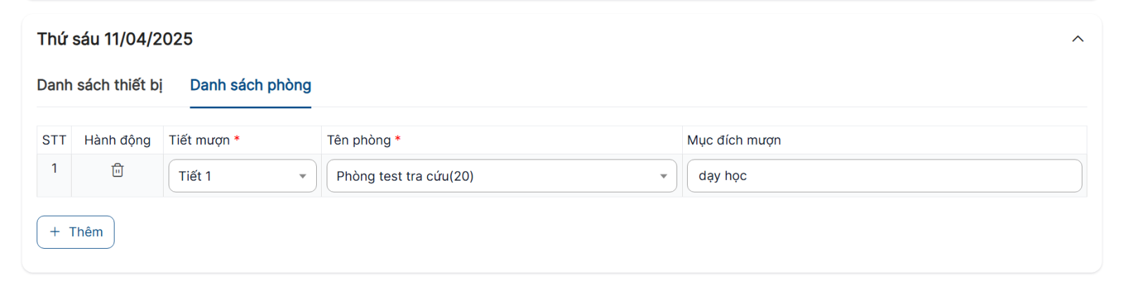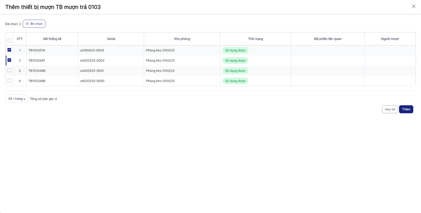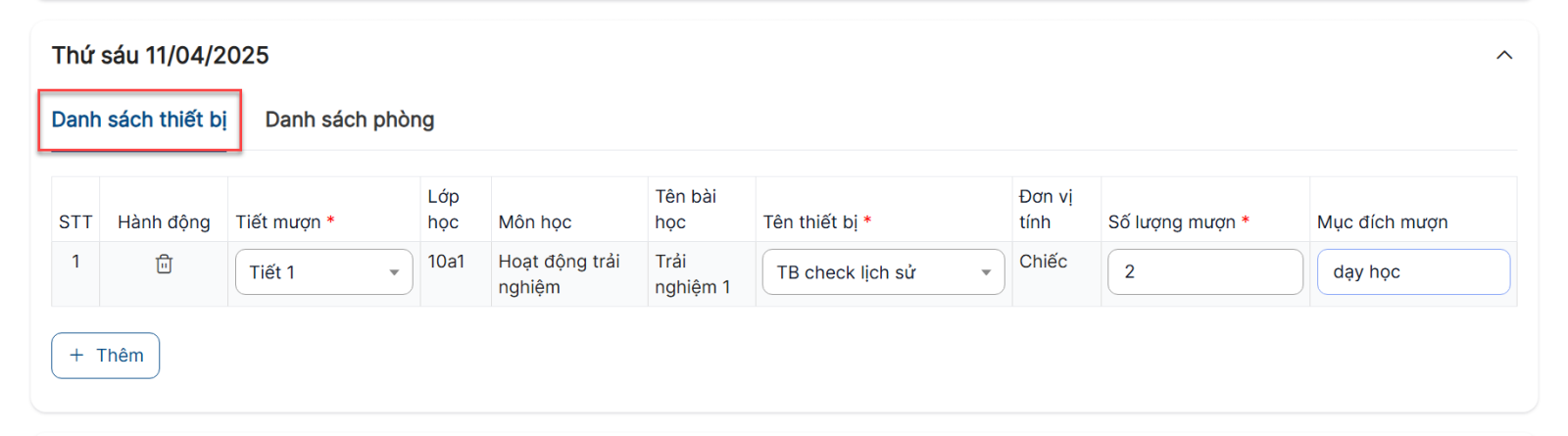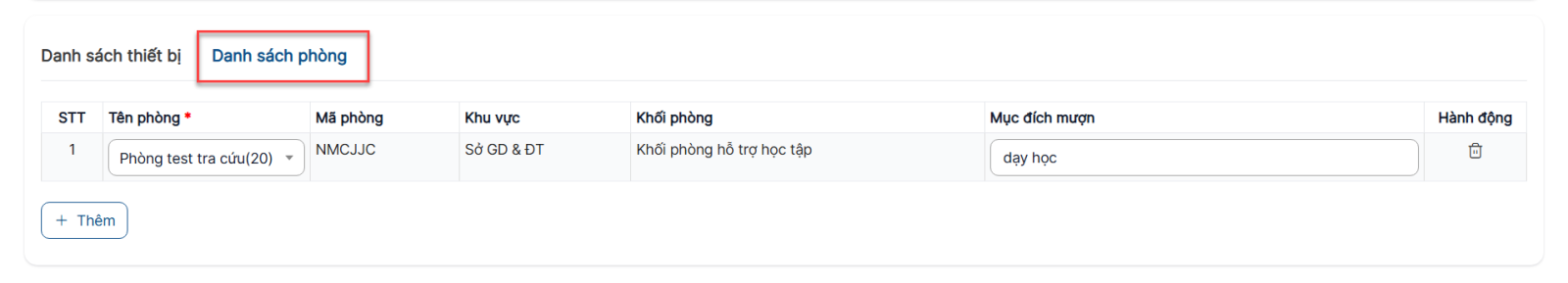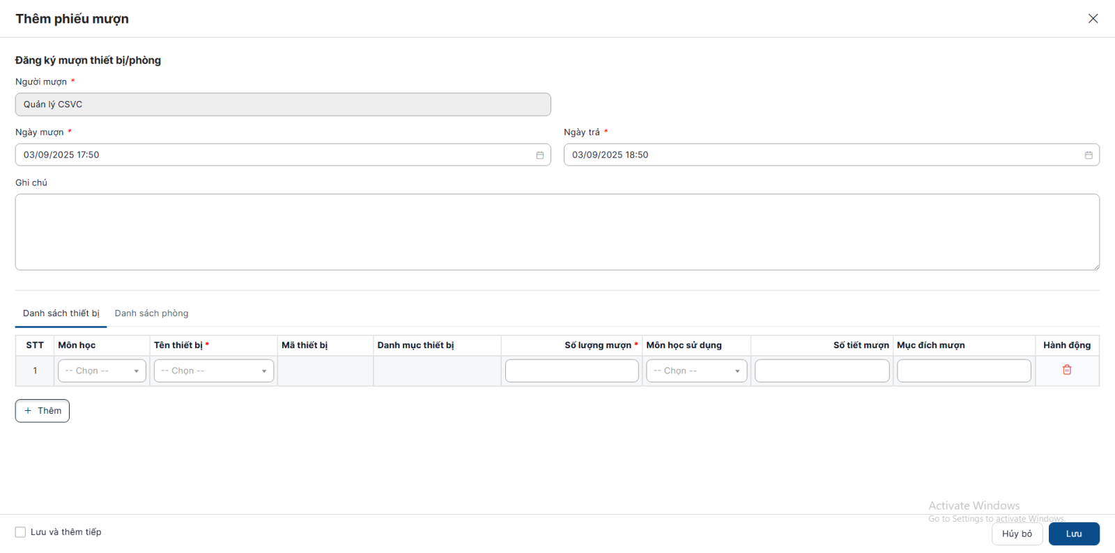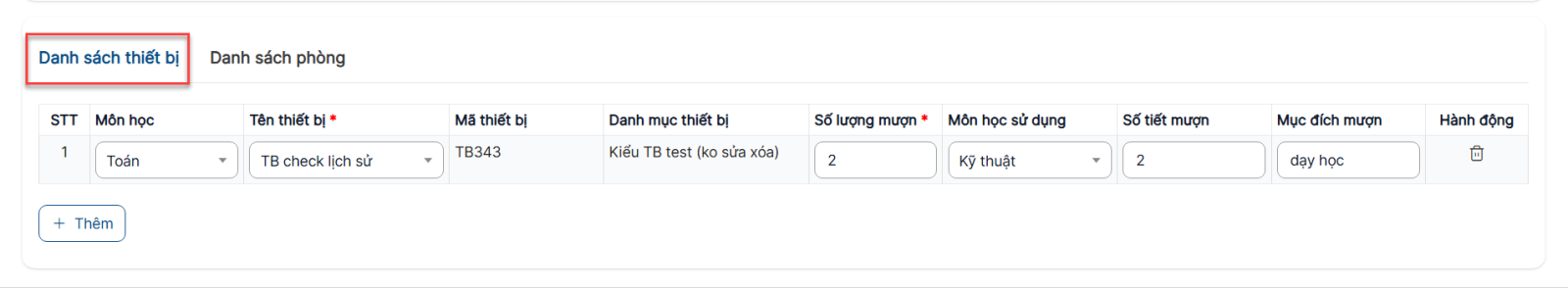 - Click Thêm để thực hiện thêm thiết bị cho mượn