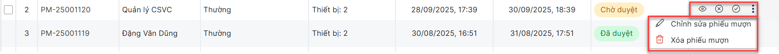 - Phiếu mượn do tài khoản cán bộ quản lý CSVC thêm mới sẽ vừa có hành động Duyệt/Từ chối, vừa có hành động Sửa, Xóa, Xem chi tiết: