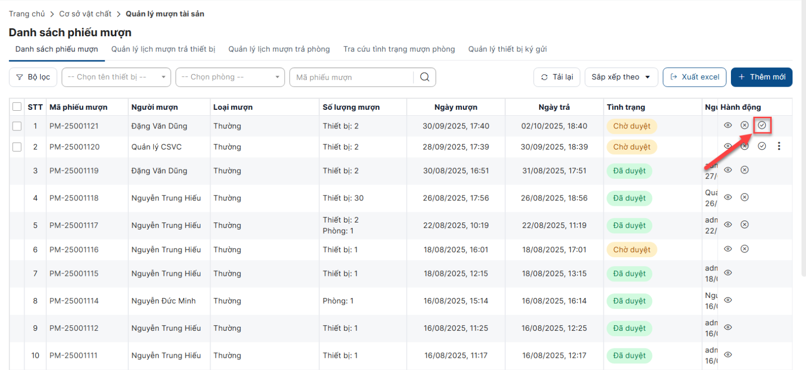 - Click icon duyệt để thực hiện duyệt phiếu mượn