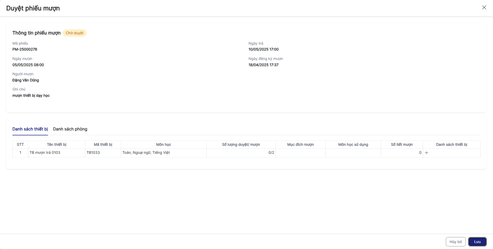 Lưu ý: Người dùng có thể duyệt phiếu mượn mà không chọn thiết bị duyệt.