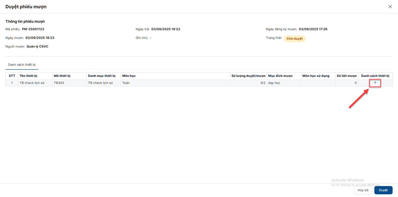 Bước 1: Trên danh sách > Click icon Duyệt phiếu mượn > Click icon Thêm thiết bị duyệt