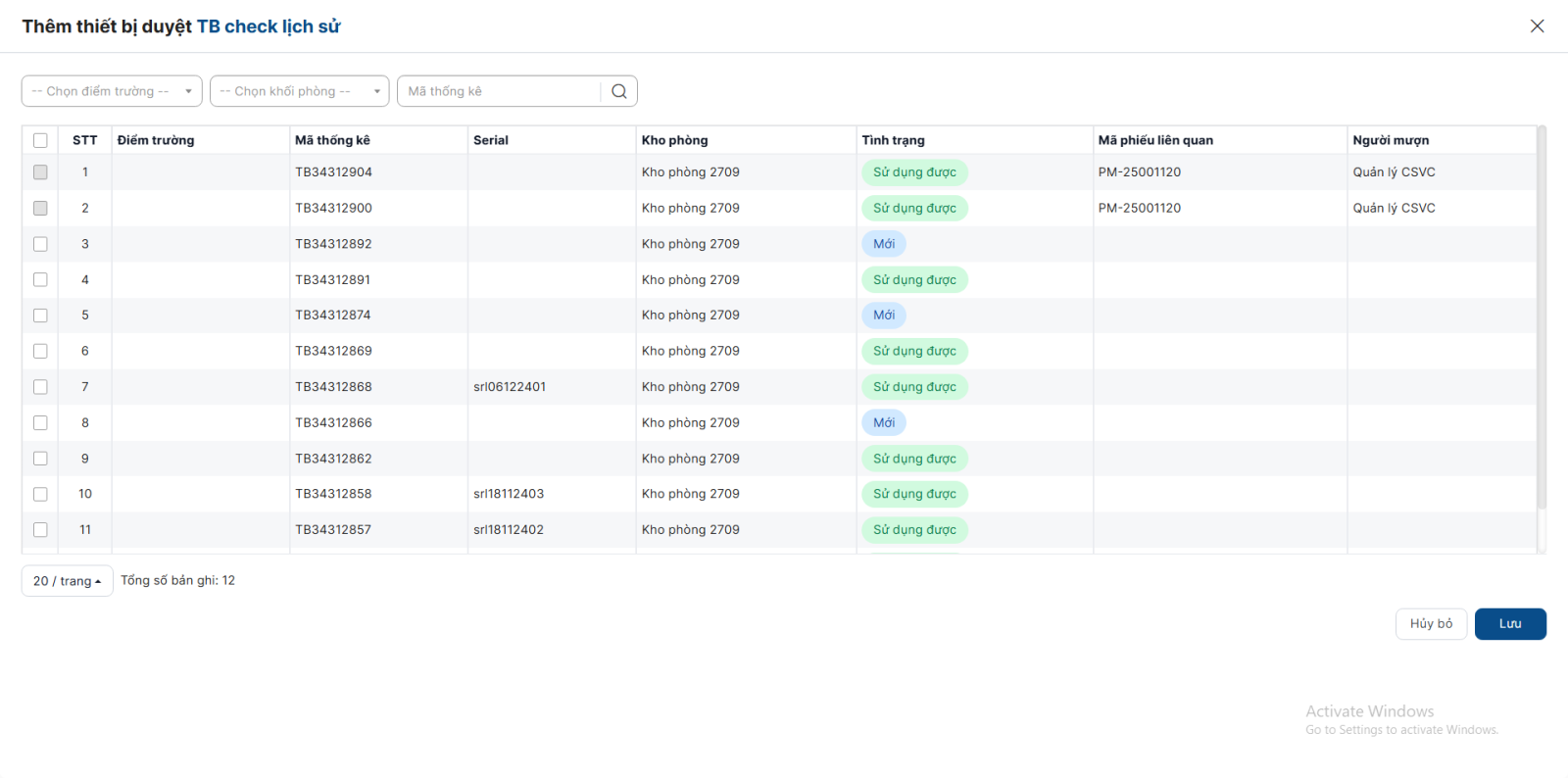 - Màn thêm thiết bị duyệt chỉ hiển thị các thiết bị ở trạng thái Sẵn sàng mượn từ menu Quản lý CSVC > tab Tất cả thiết bị