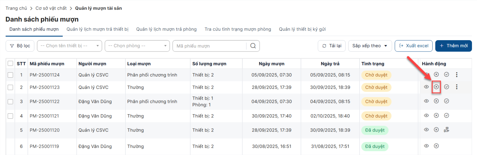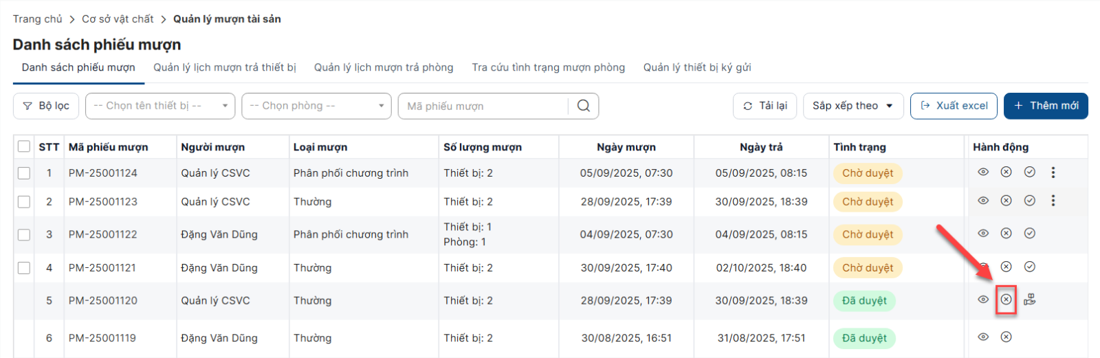 Bước 1: Trên màn hình danh sách > Click icon Hủy duyệt tại phiếu mượn Đã duyệt nhưng chưa giao thiết bị.