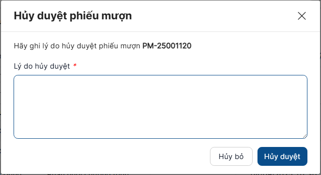 - Click Xác nhận để thực hiện hủy duyệt phiếu mượn thành công > Bản ghi chuyển sang trạng thái Từ chối duyệt và có icon xem lý do từ chối.
