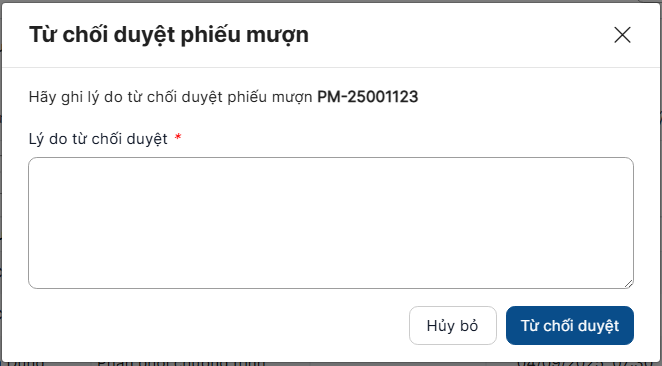- Click icon từ chối duyệt để thực hiện từ chối 1 phiếu mượn