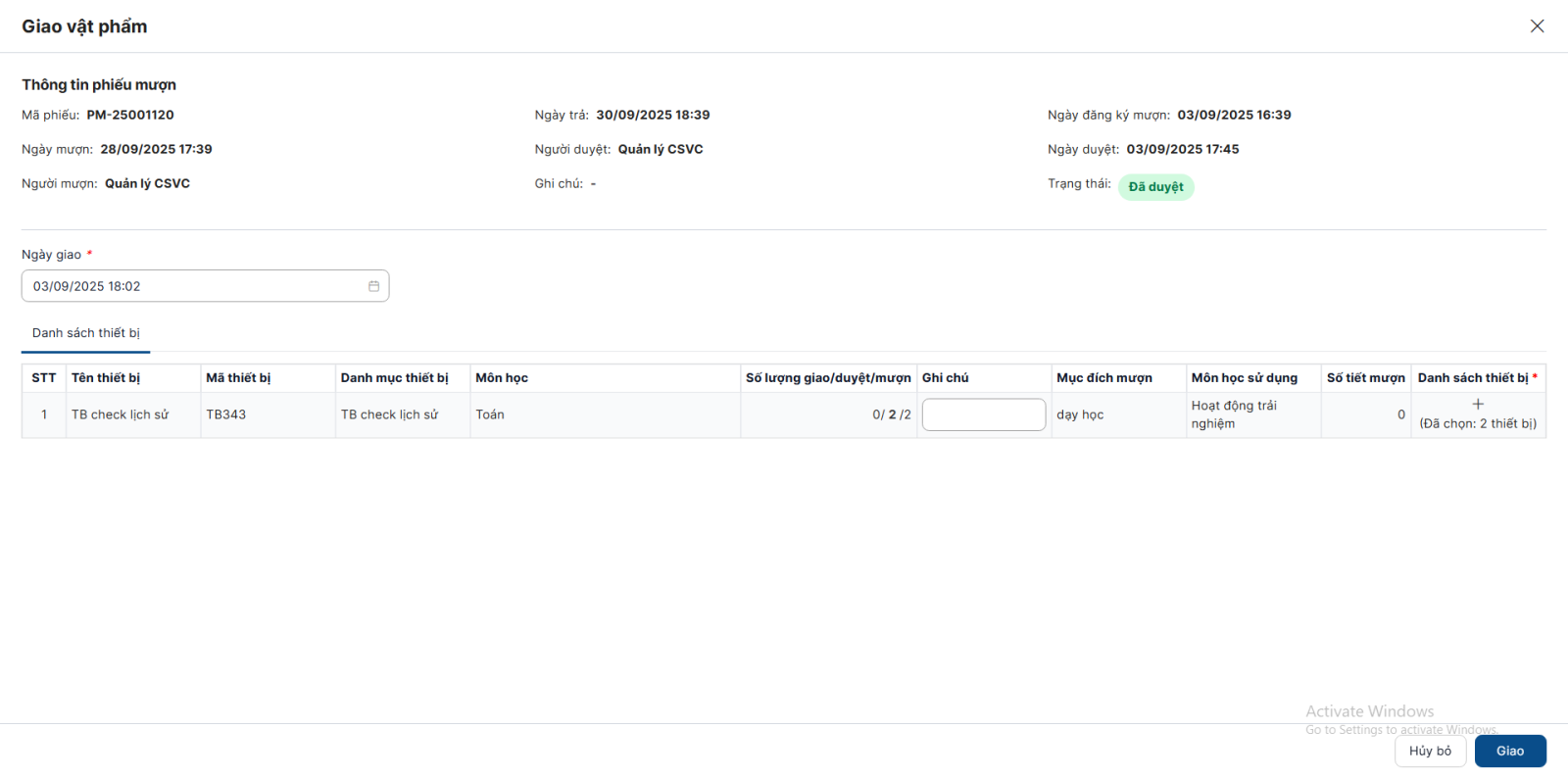 - Click Lưu để xác nhận giao tài sản thành công (icon giao vật phẩm sẽ ẩn đi nếu giao đủ số lượng vật phẩm đăng ký mượn). Các thiết bị được giao hiển thị ở tab Quản lý lịch mượn trả thiết bị với tình trạng là Đang mượn.