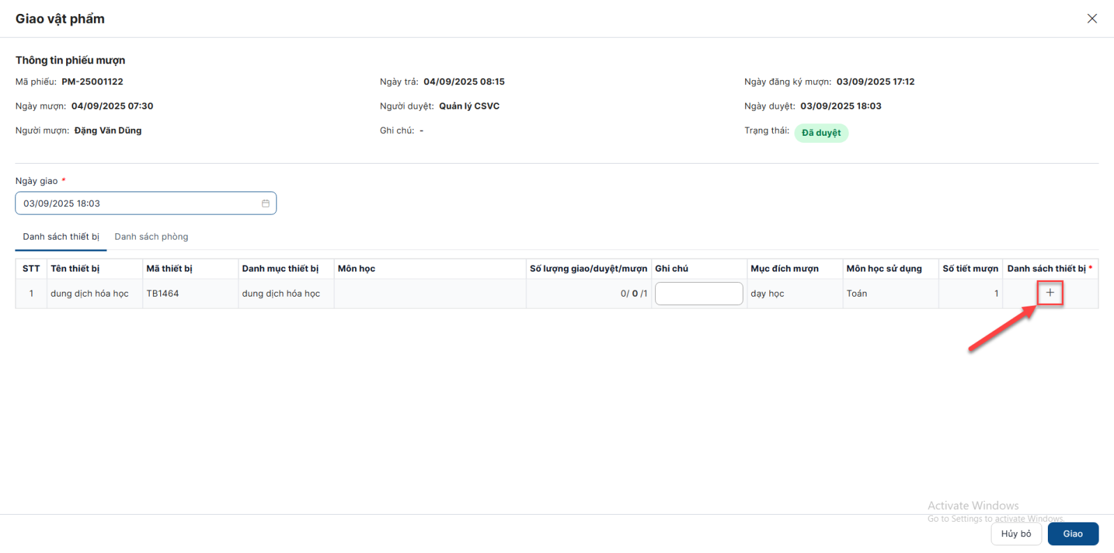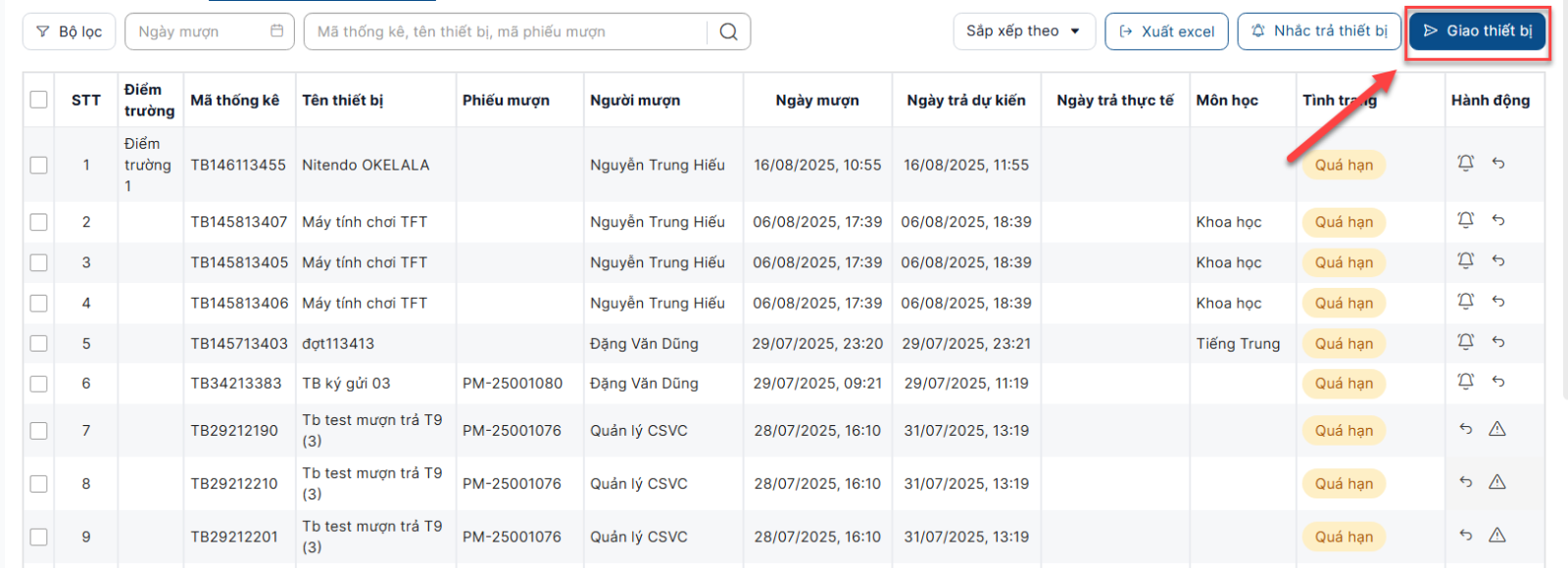 - Click button Giao thiết bị để thực hiện giao nhanh thiết bị cho người mượn