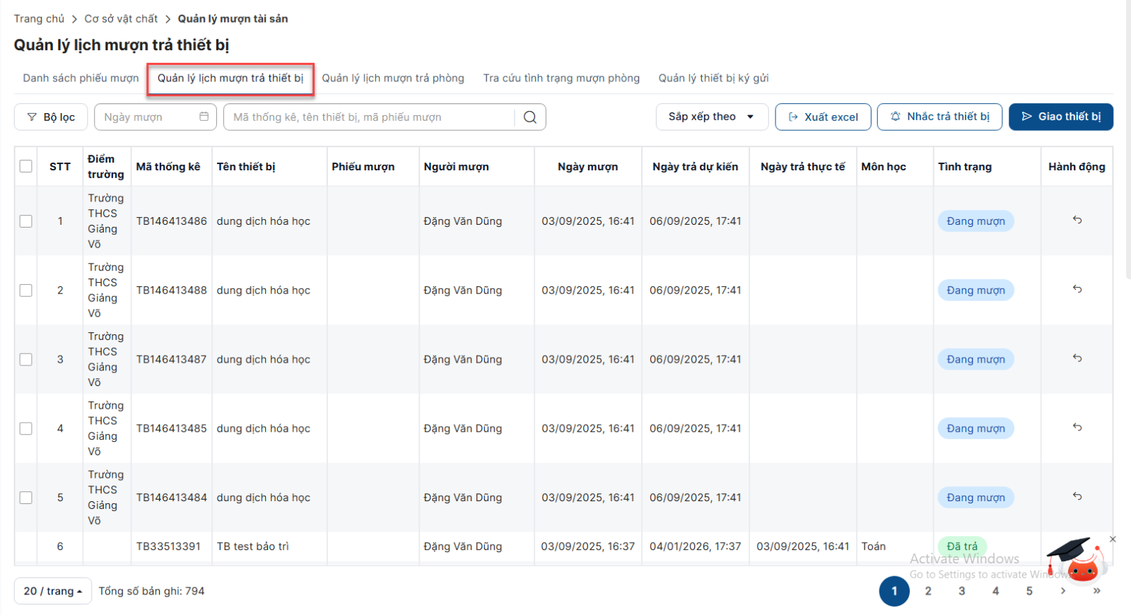 - Click Lưu để hoàn thành việc giao nhanh thiết bị, hiển thị những thiết bị được giao tại tab Quản lý lịch mượn trả thiết bị với trạng thái Đang mượn. Tài khoản giáo viên vào menu Mượn tài sản, tab Quản lý lịch mượn trả thiết bị cũng nhìn thấy thiết bị đang được cho mượn.