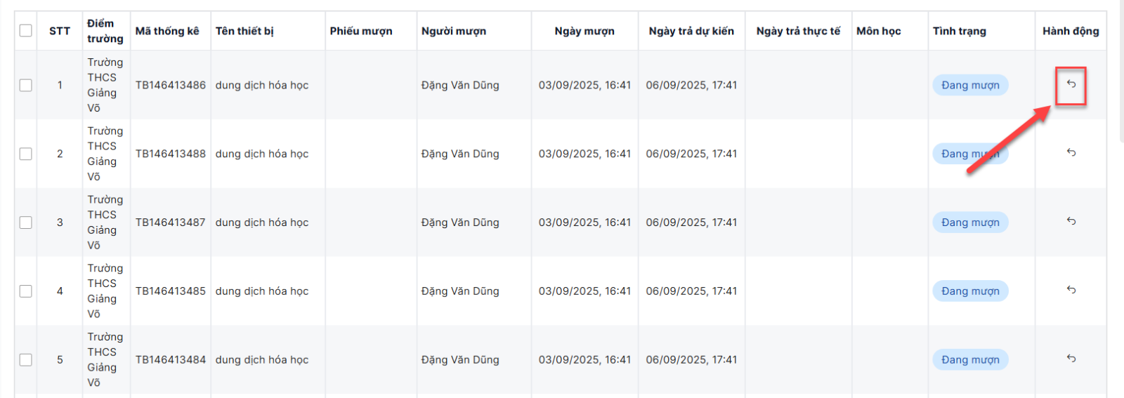 Bước 1: Trên màn hình danh sách > Click icon Trả thiết bị tại bản ghi có tình trạng là Đang mượn/Quá hạn