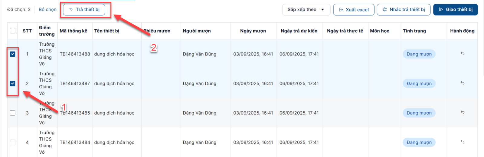 Bước 1: Trên màn hình danh sách > Tích chọn checkbox tại các bản ghi Đang mượn/Quá hạn > Click button trả thiết bị