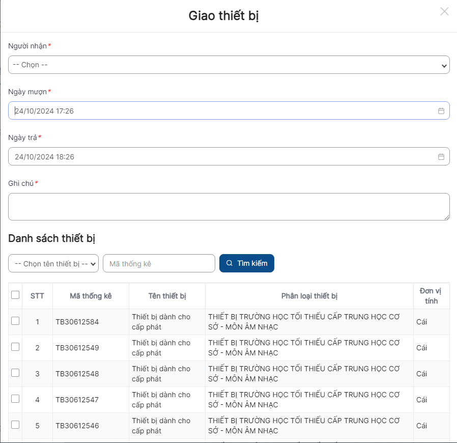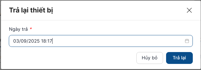 Lưu ý: Ngày trả không được nhỏ hơn Ngày giao thiết bị và không được lớn hơn thời gian hiện tại.