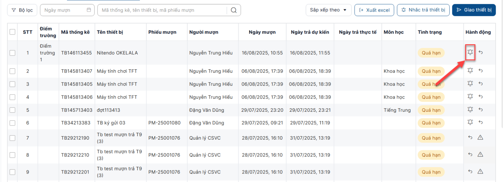 Bước 1: Trên màn hình danh sách > Click icon nhắc nhở trả thiết bị tại bản ghi có tình trạng Quá hạn