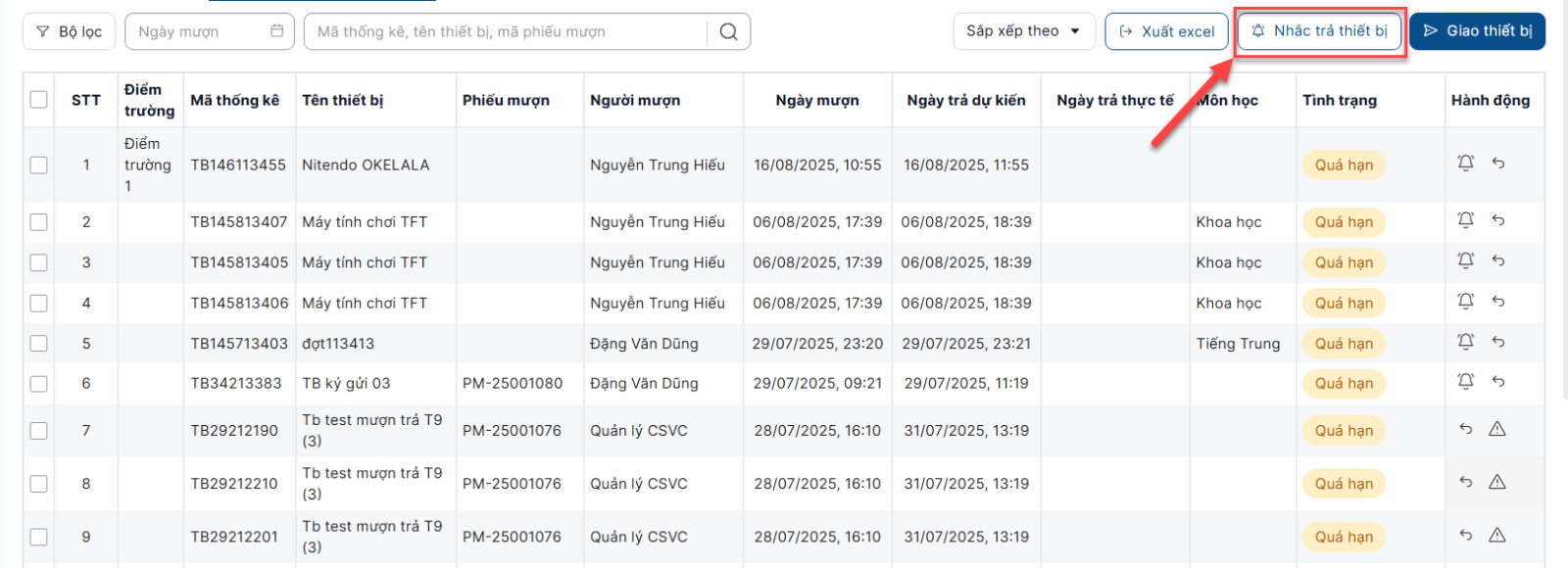 Bước 1: Trên màn hình danh sách > Click button Nhắc trả thiết bị