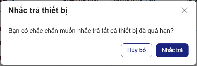+ Click “Nhắc trả” để xác nhận nhắc nhở trả thiết bị (sau khi nhắc nhở trả thiết bị thành công, thông báo sẽ gửi đến tài khoản giáo viên đang được cấp phát thiết bị)