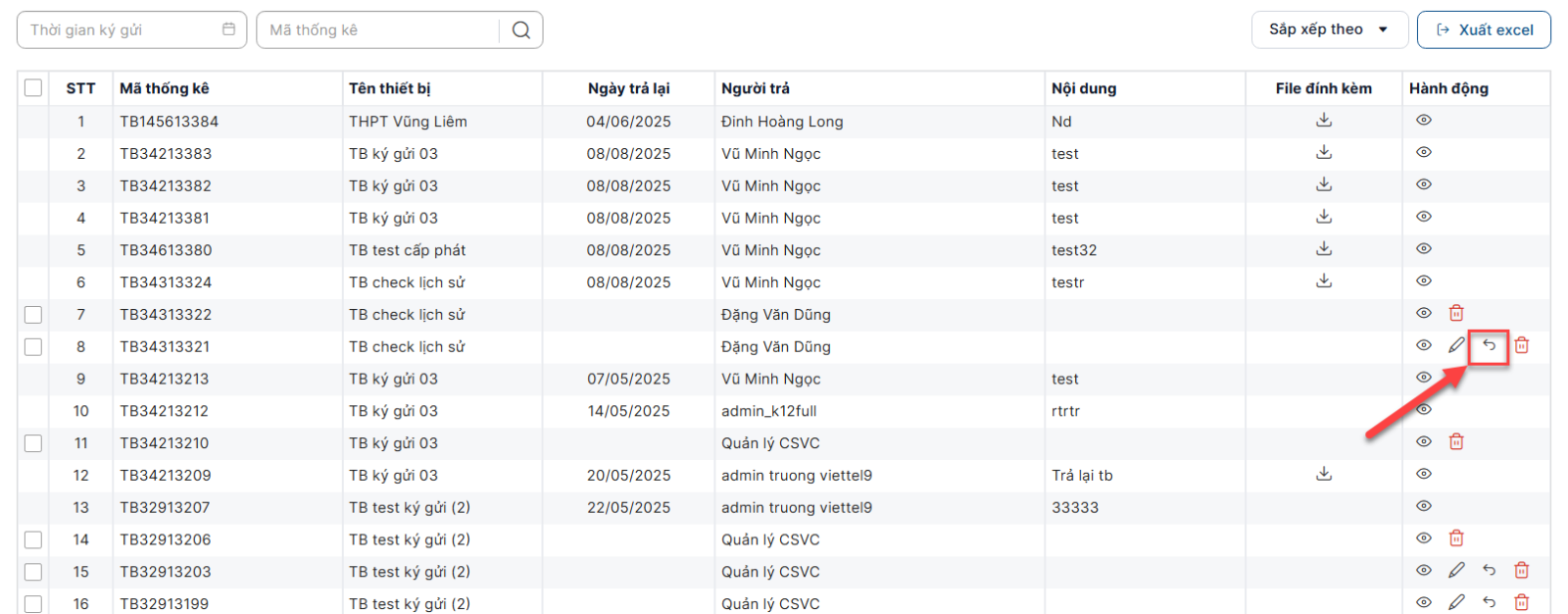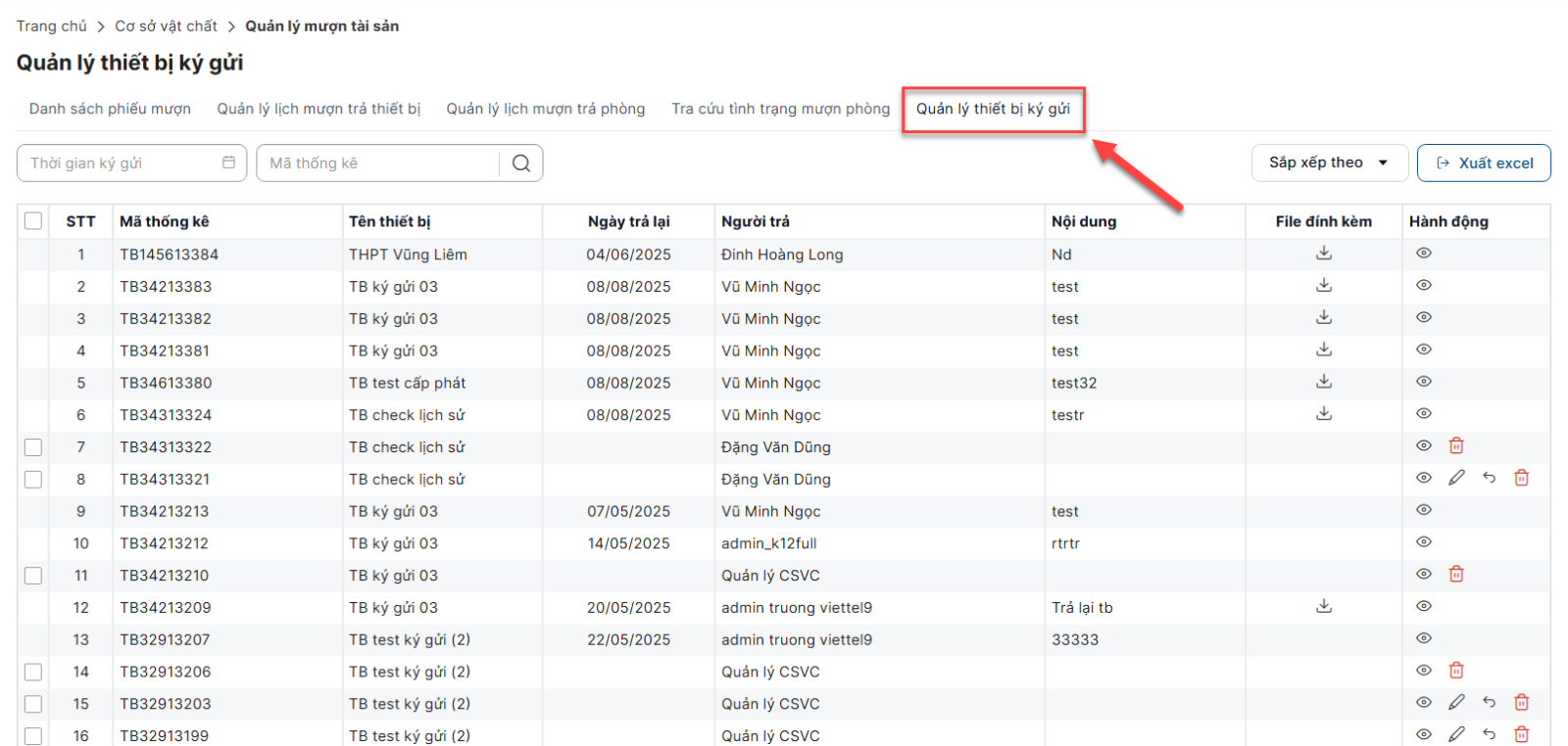 + Click “Trả” để thực hiện trả thiết bị ký gửi thành công. Thiết bị sau khi trả sẽ bị ẩn khỏi menu Quản lý CSVC > tab Tất cả thiết bị.