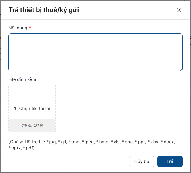 Bước 2: Hệ thống hiển thị màn hình trả thiết bị > Nhập nội dung (bắt buộc) và update file đính kèm (Nếu cần)