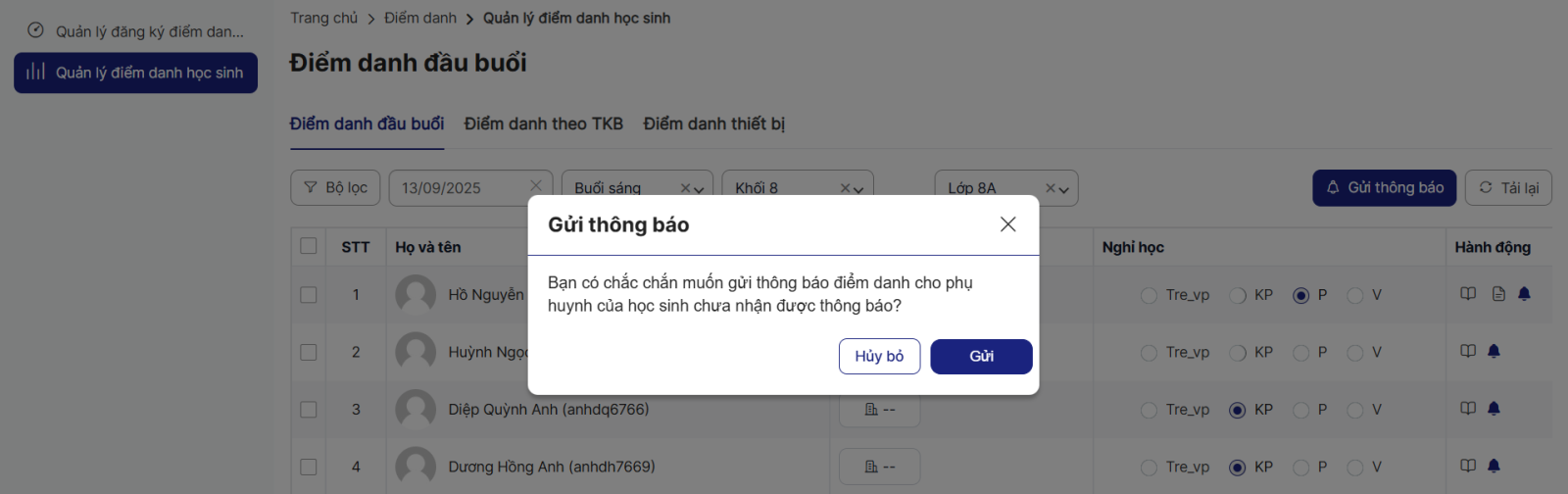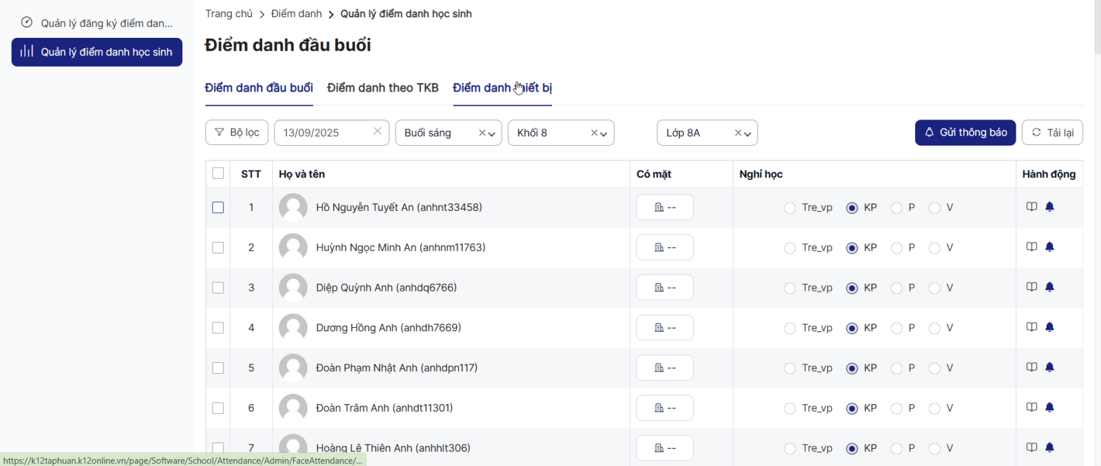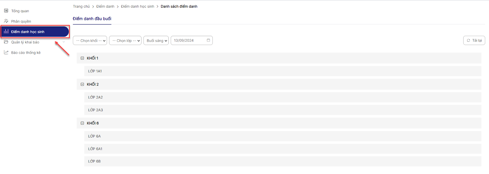 Bước 1: Truy cập menu Điểm danh học sinh > Chọn Tab Điểm danh đầu buổi