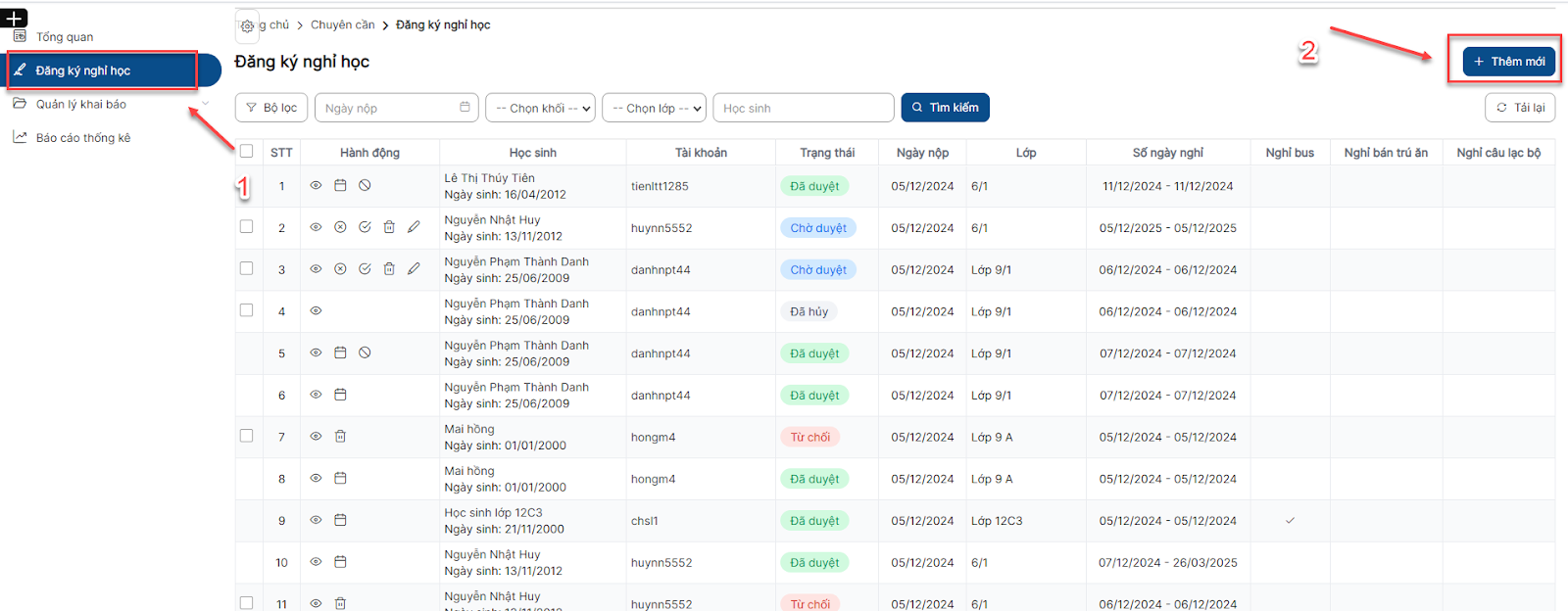 Bước 1: Vào module Chuyên cần > Chọn menu Đăng ký nghỉ học > Click button Thêm mới