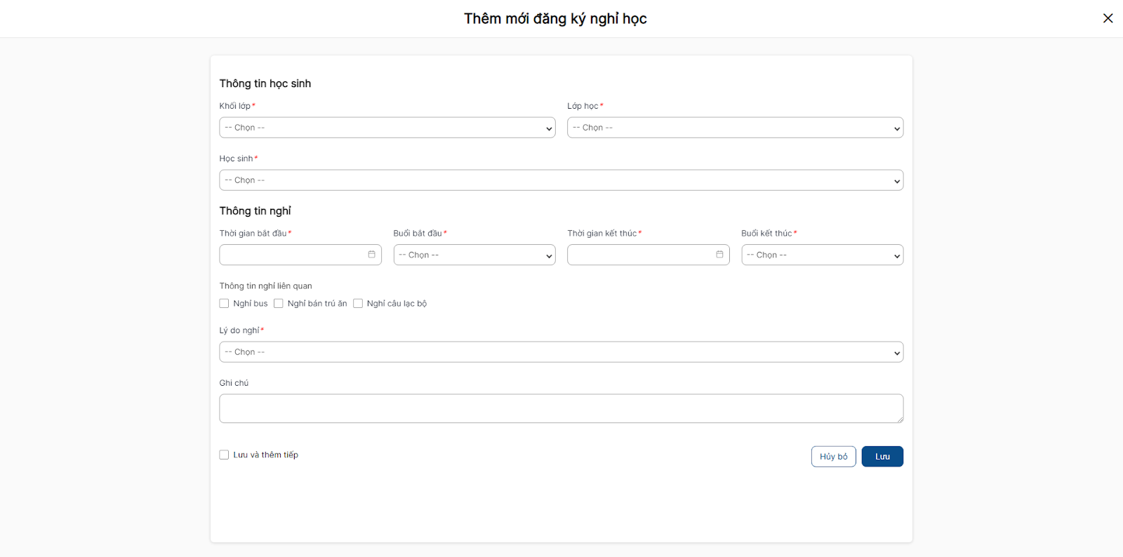 Bước 2: Bước 2: Hiển thị màn hình thêm mới Đăng ký nghỉ học. Thực hiện nhập các trường thông tin, trong đó các trường có dấu (*) là bắt buộc nhập.