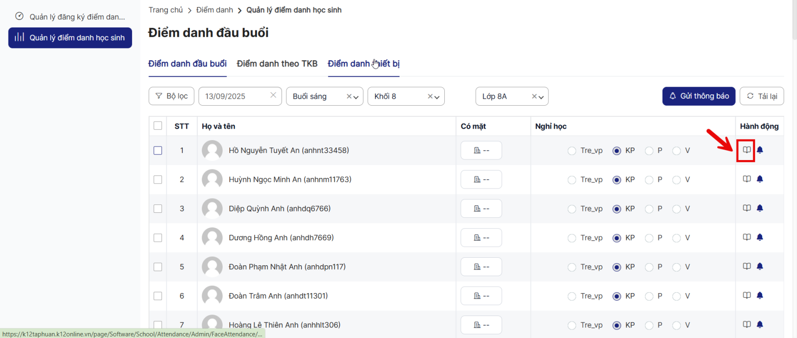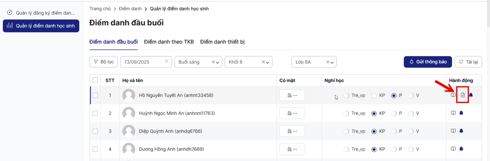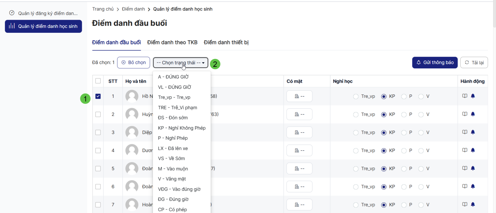 Bước 2: Chọn trạng thái điểm danh học sinh