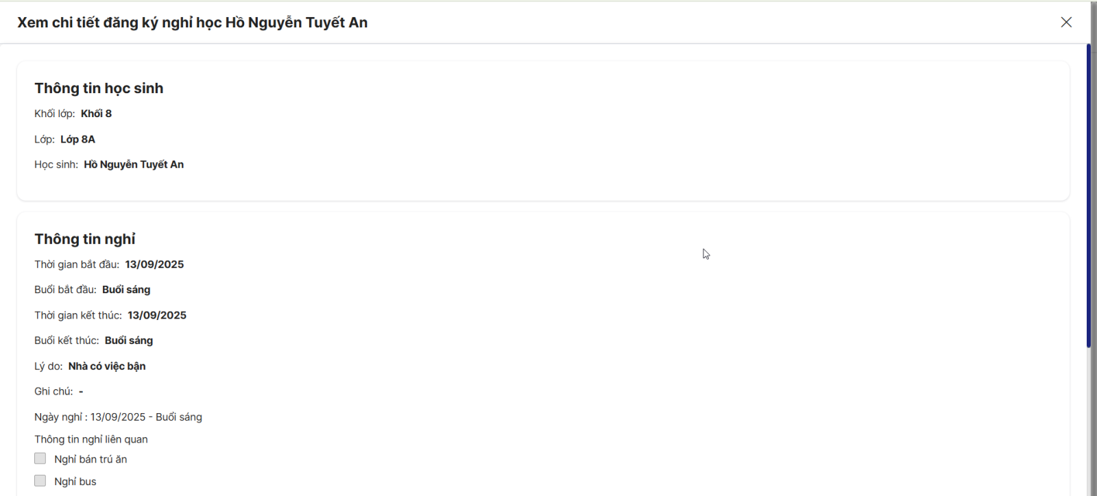 Bước 6: Màn hình hiển thị chi tiết đơn đăng ký nghỉ học của học sinh