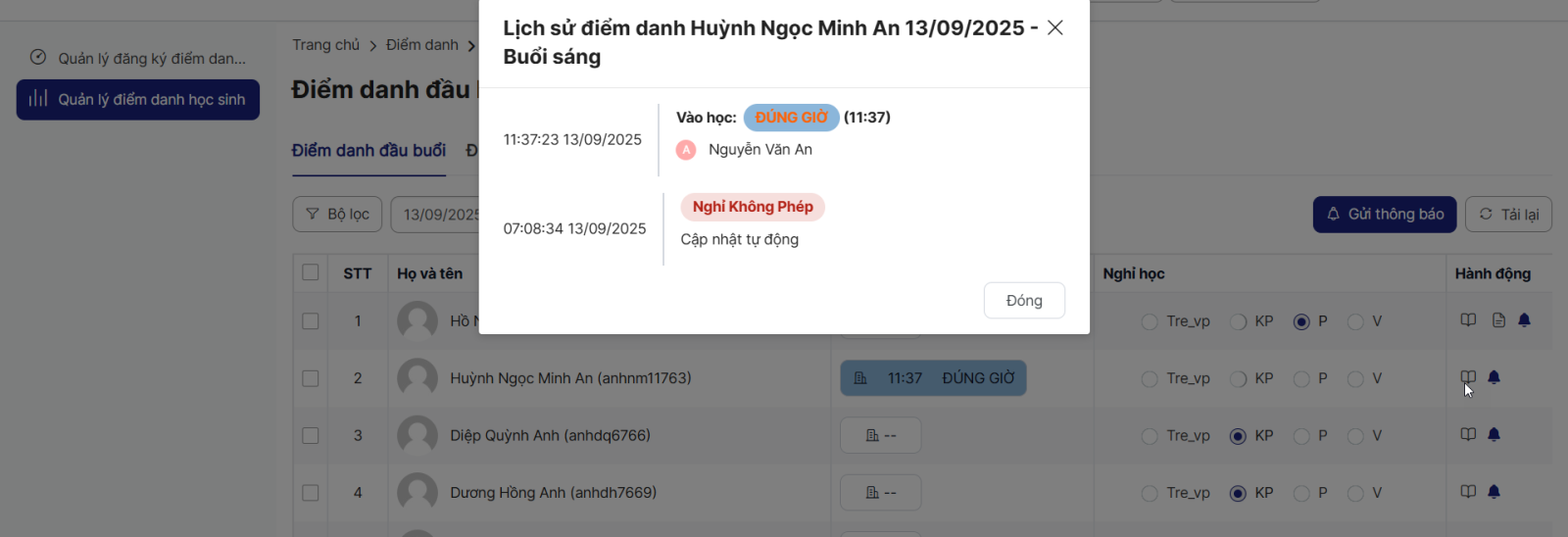 Bước 3: Hiển thị lịch sử điểm danh của học sinh