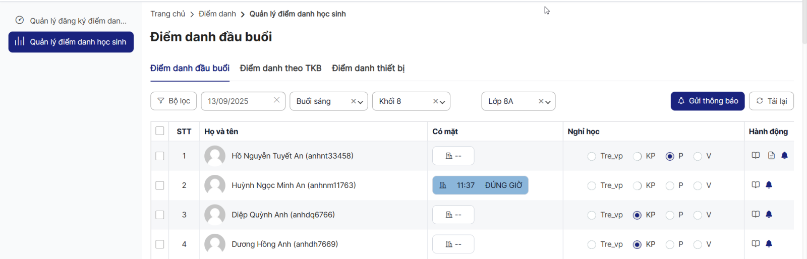 Bước 4: Vào module Điểm danh > Chọn menu Quản lý điểm danh học sinh > Tab điểm danh đầu buổi