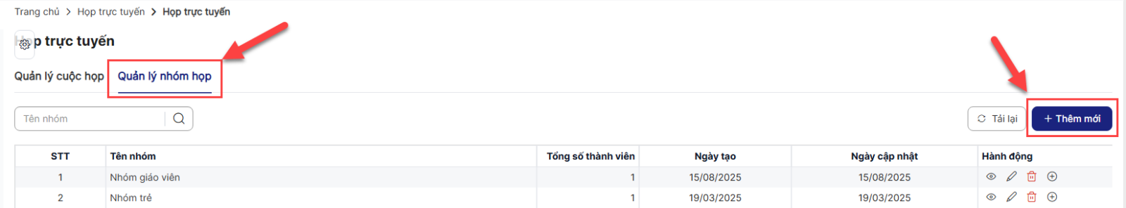 Bước 2: Chọn tab Quản lý nhóm họp > Nhấn button Thêm mới