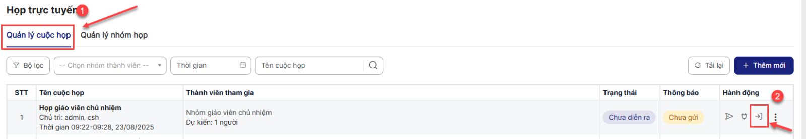 Bước 2: Chọn tab Quản lý cuộc họp > Nhấn icon Vào họp để tham gia chủ trì cuộc họp