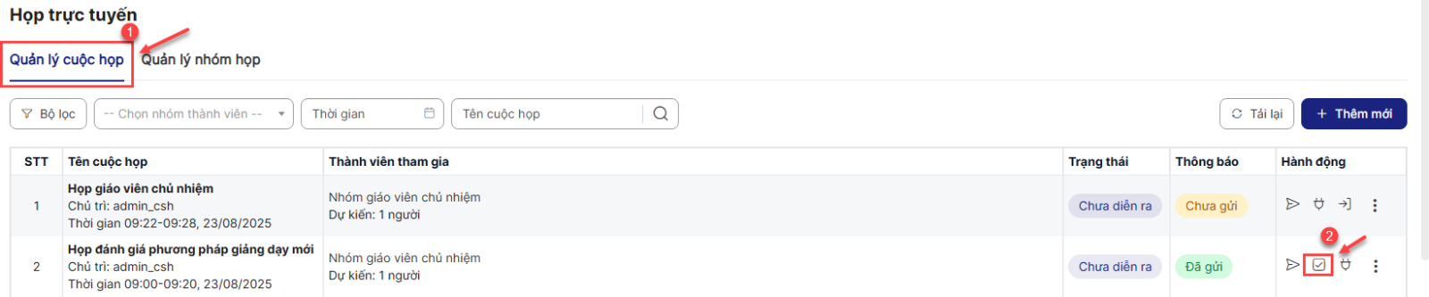 Bước 2: Chọn tab Quản lý cuộc họp > Nhấn icon Gửi thông báo cuộc họp