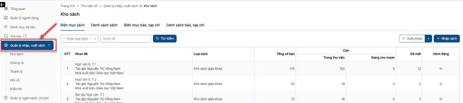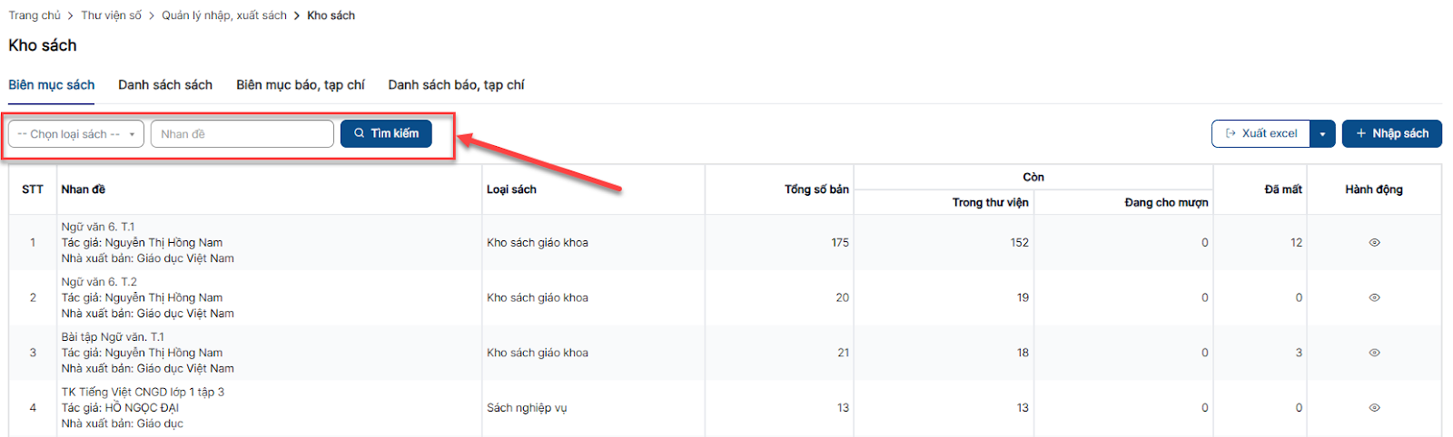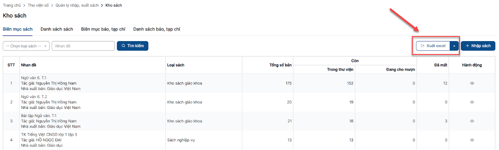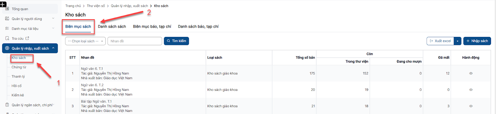 Bước 1: Click menu Kho sách > Tab Danh sách sách