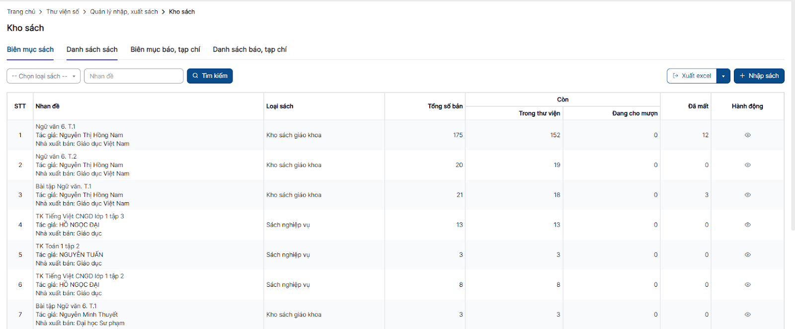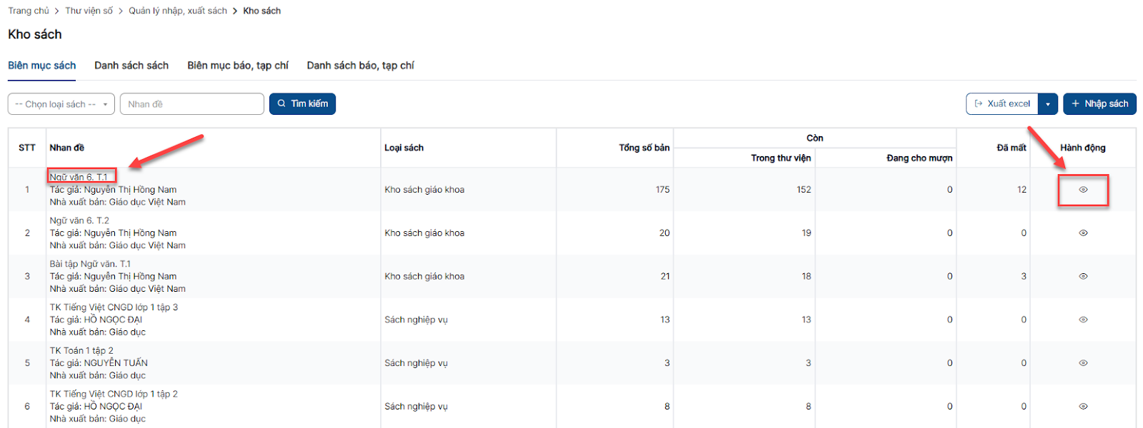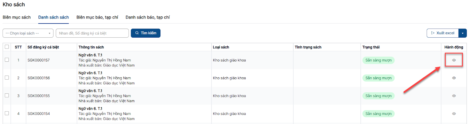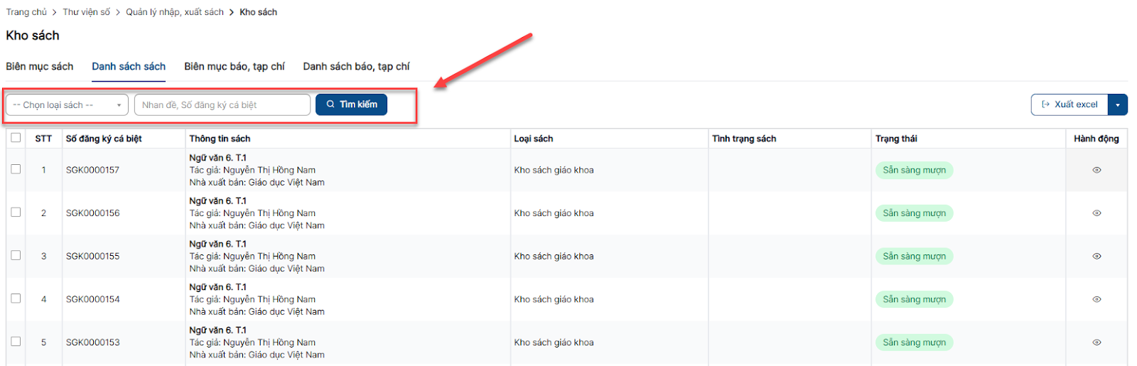 Bước 1: Click menu Kho sách > Tab Danh sách sách
