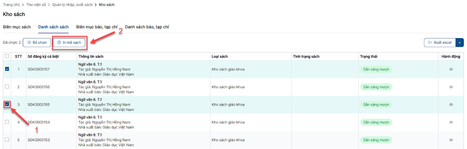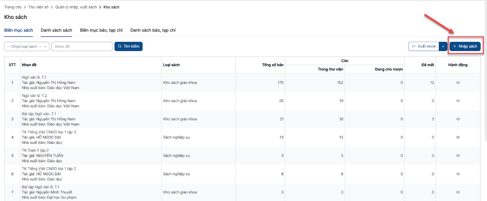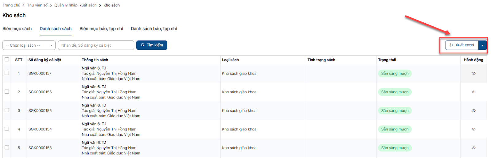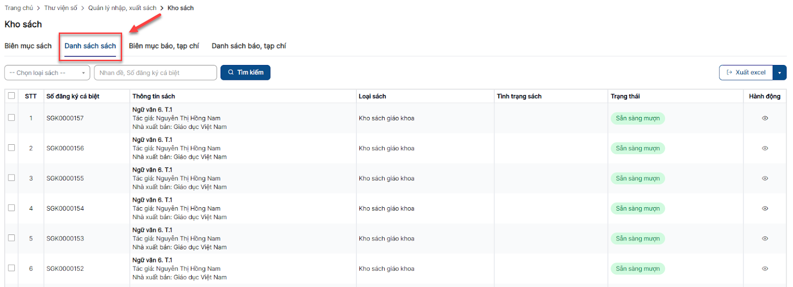 Bước 1: Tại menu Kho sách > Tab Danh sách sách