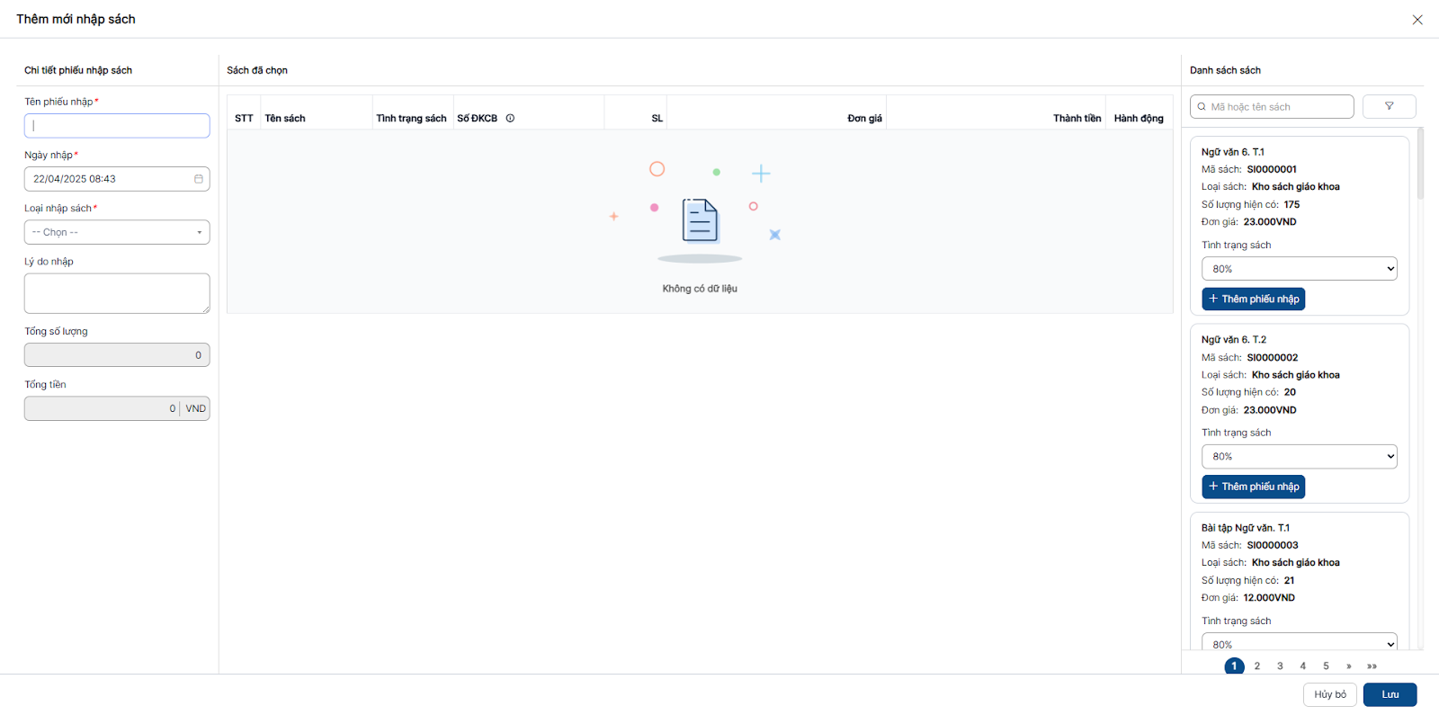 Thêm mới phiếu nhập sách