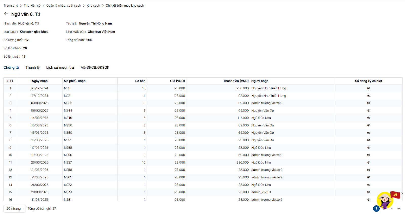 Mục đích: Trường thực hiện nhập số lượng sách của từng đầu mục sách, quản lý trạng thái của từng cuốn sách. Thực hiện thanh lý, hồi cố, kiểm kê sách thư viện