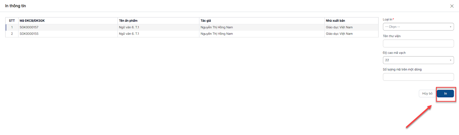 Bước 1: Trên màn hình danh sách > Click checkbox đầu bản ghi > Click button in mã vạch