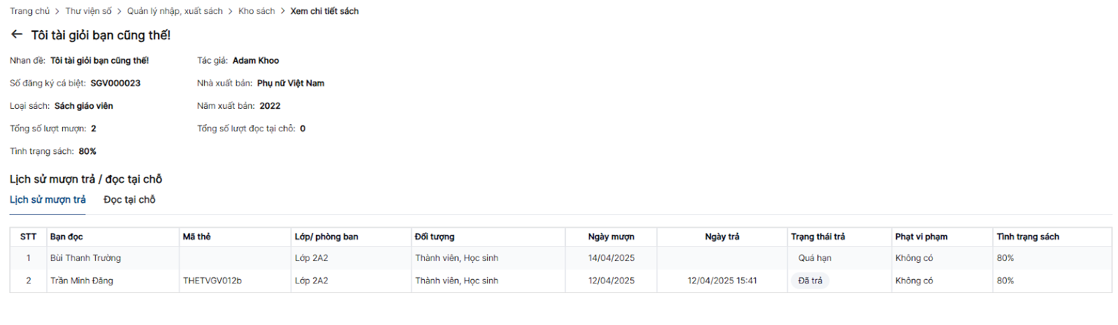+ Chọn Tab Lịch sử mượn trả để xem danh sách lịch sử mượn trả