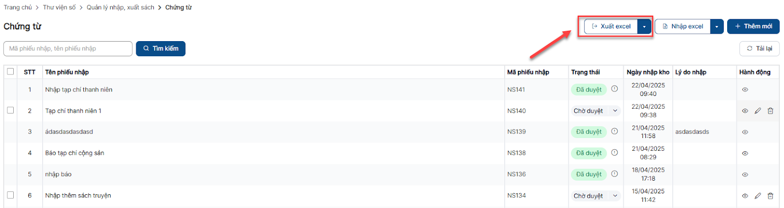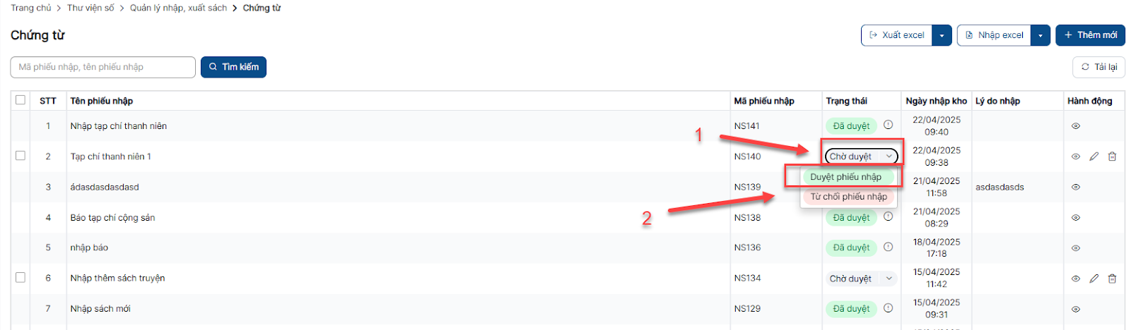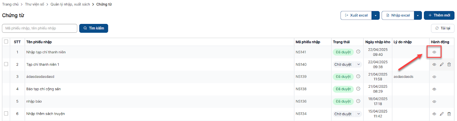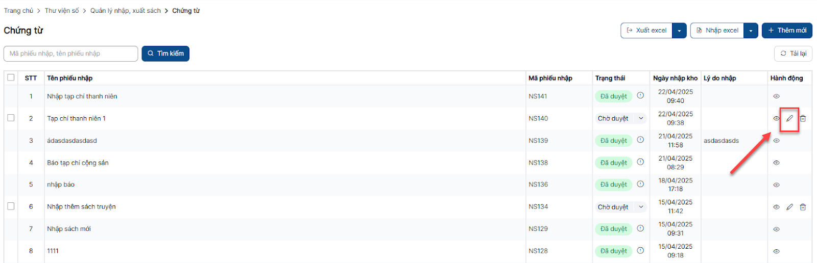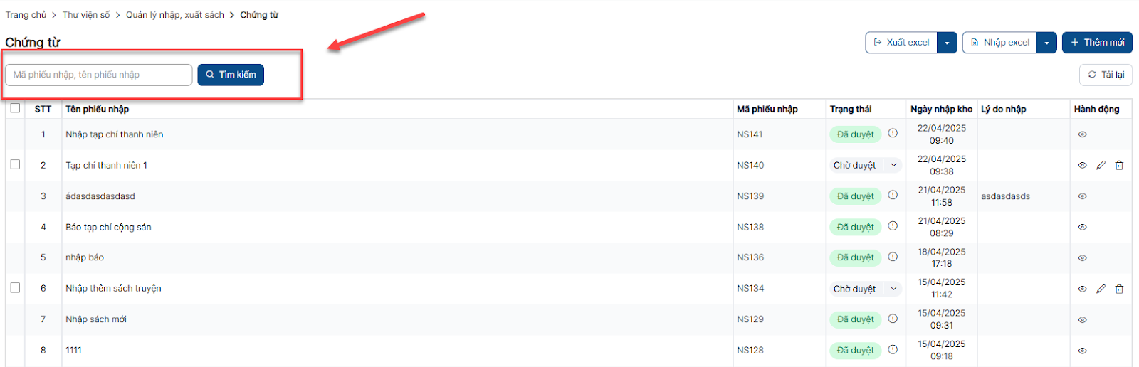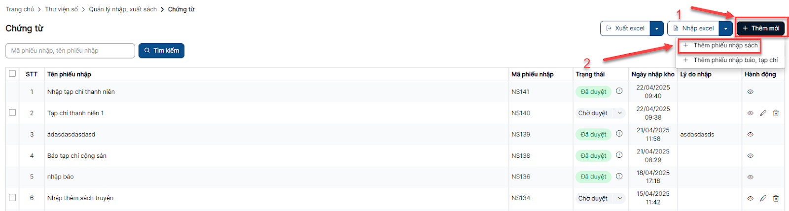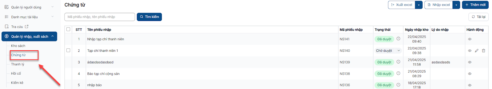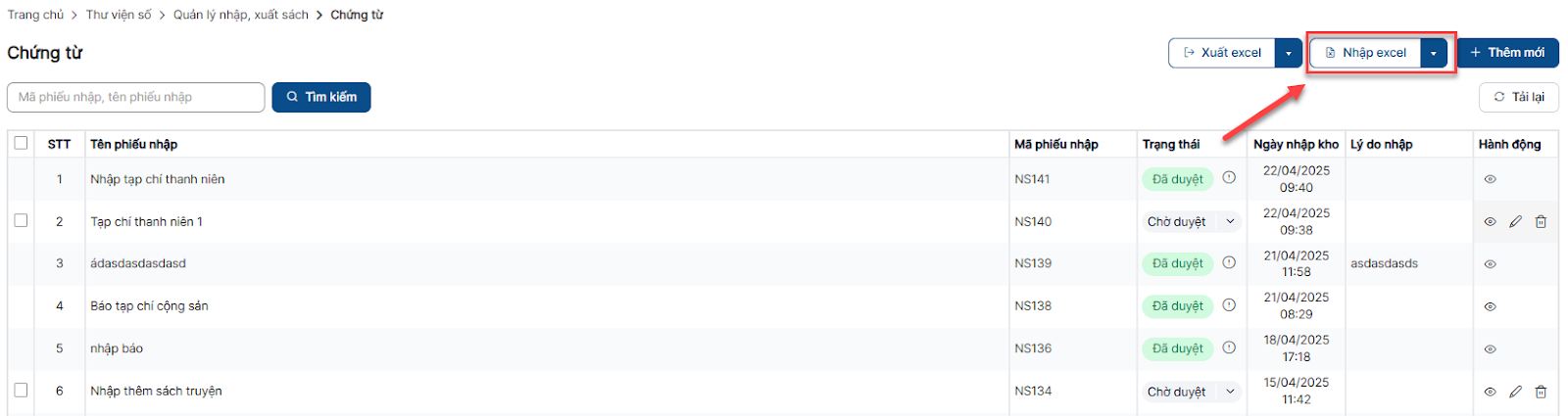 Bước 1: Trên màn hình danh sách > Click button Nhập sách