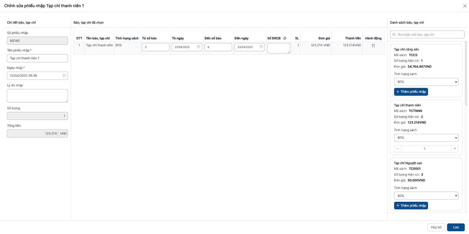 Bước 2: Nhập/chọn đầy đủ các trường bắt buộc (là các trường có dấu *) > click Lưu để thêm mới phiếu nhập sách