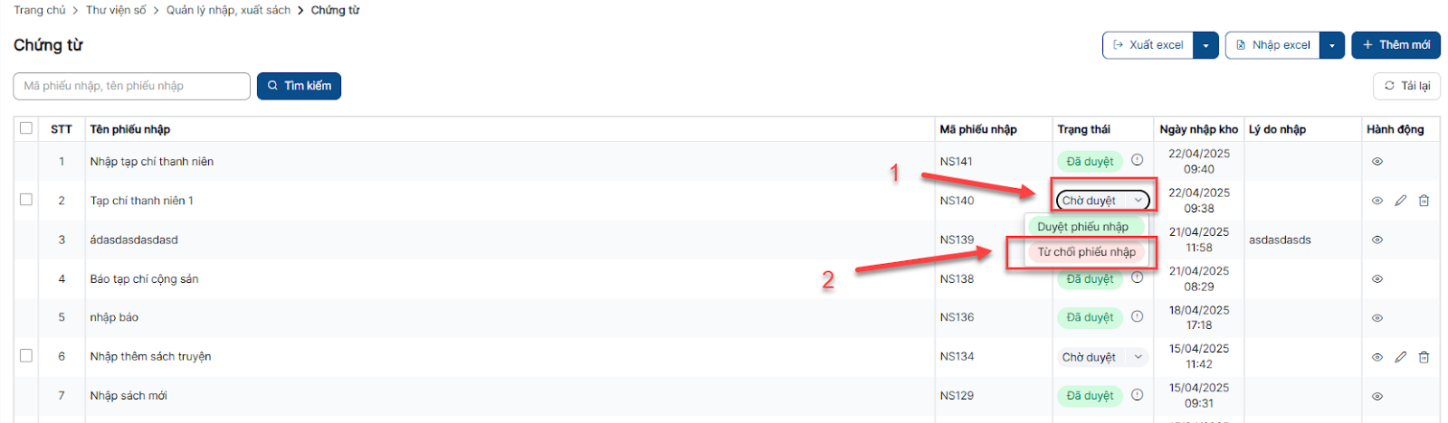 Bước 1: Trên màn hình danh sách > Click icon Chờ duyệt > Click icon Từ chối phiếu nhập