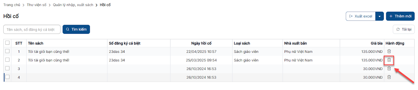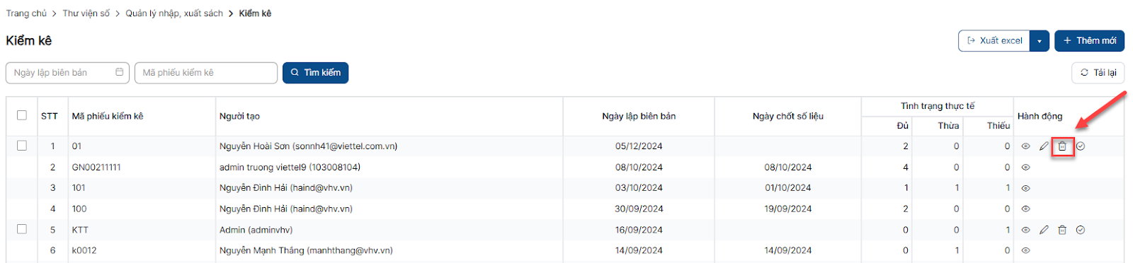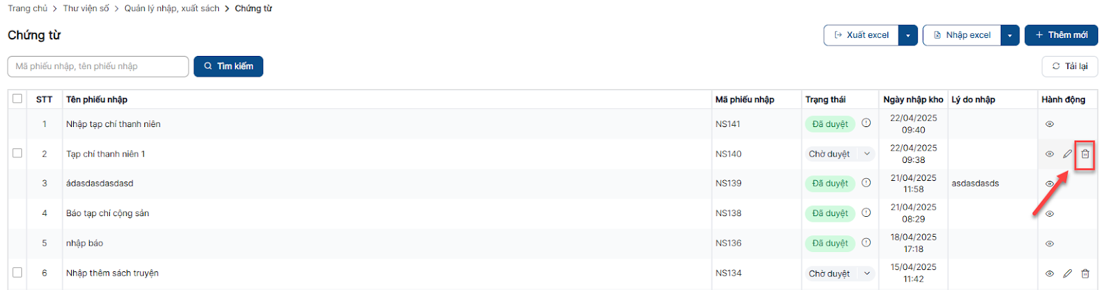 Bước 1: Trên màn hình danh sách > click icon xóa