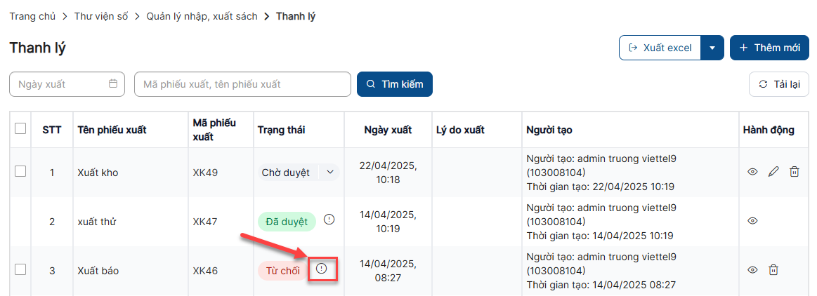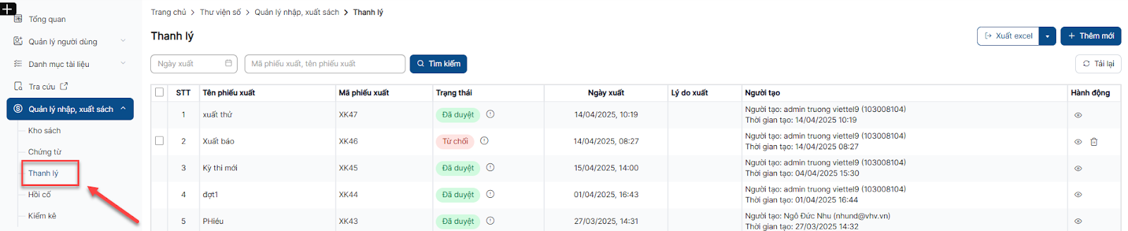+ Chọn Tab Thanh lý để xem danh sách phiếu xuất