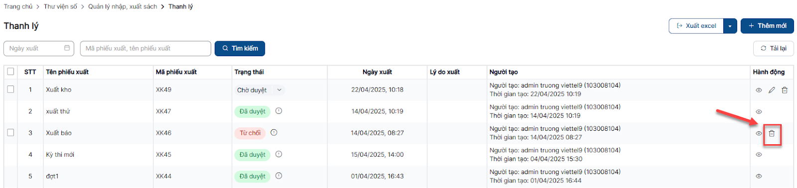 Bước 1: Trên màn hình danh sách > Click icon xóa