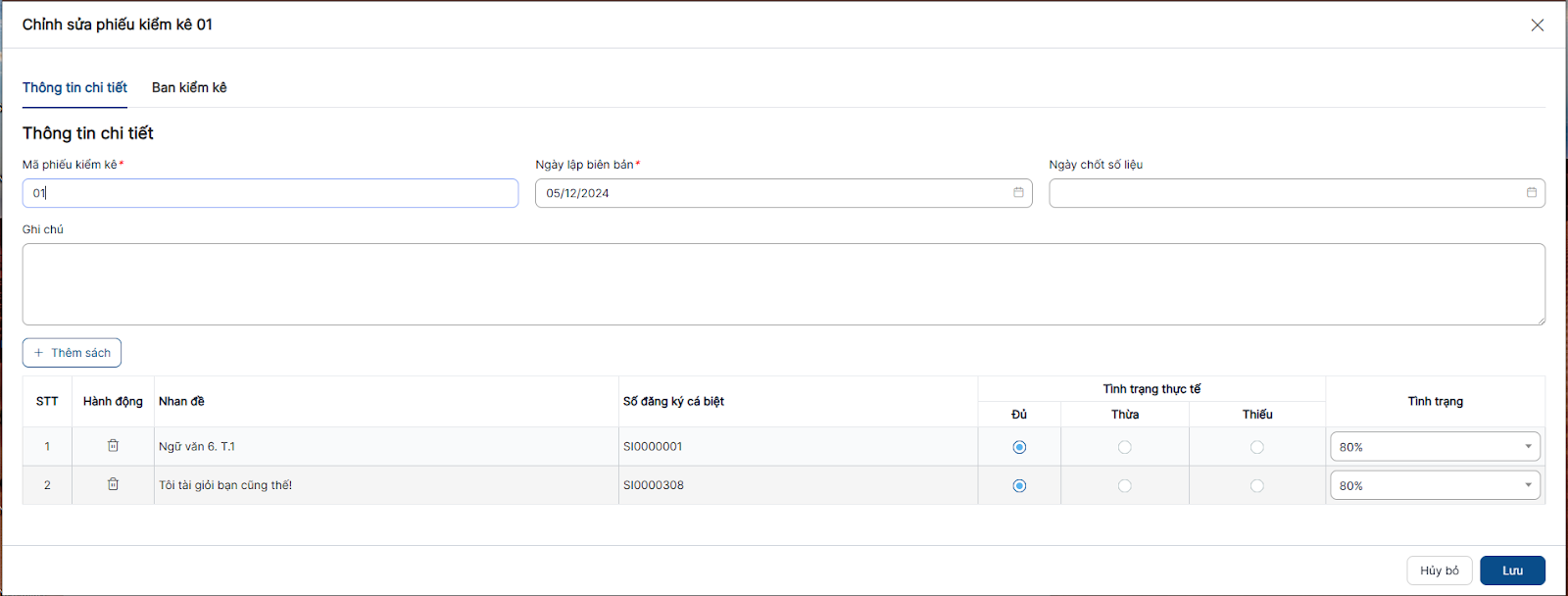 Bước 2: Nhập/chọn đầy đủ các trường bắt buộc > click button Thêm sách để thêm sách cần kiểm kê > Sang tab Ban kiểm kê click button Thêm thành viên > chọn trưởng ban kiểm kê > click Lưu để thêm mới phiếu kiểm kê