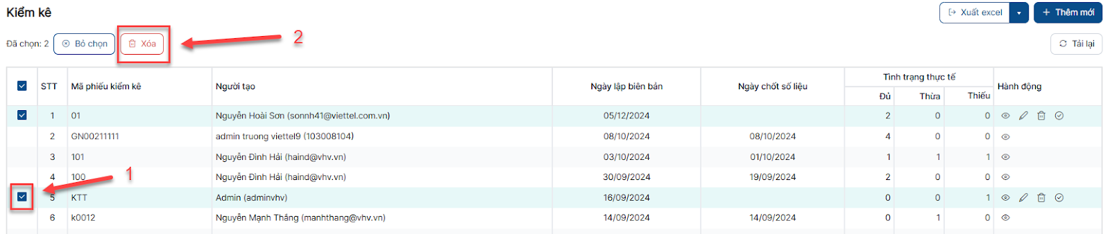 Bước 1: Trên màn hình danh sách > Click icon Xóa