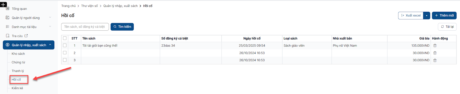 Bước 2: Nhập/Chọn các trường thông tin bắt buộc (là các trường có dấu *), có thể click button +Chọn sách để thêm sách hồi cố > Click Lưu để thêm mới hồi cố