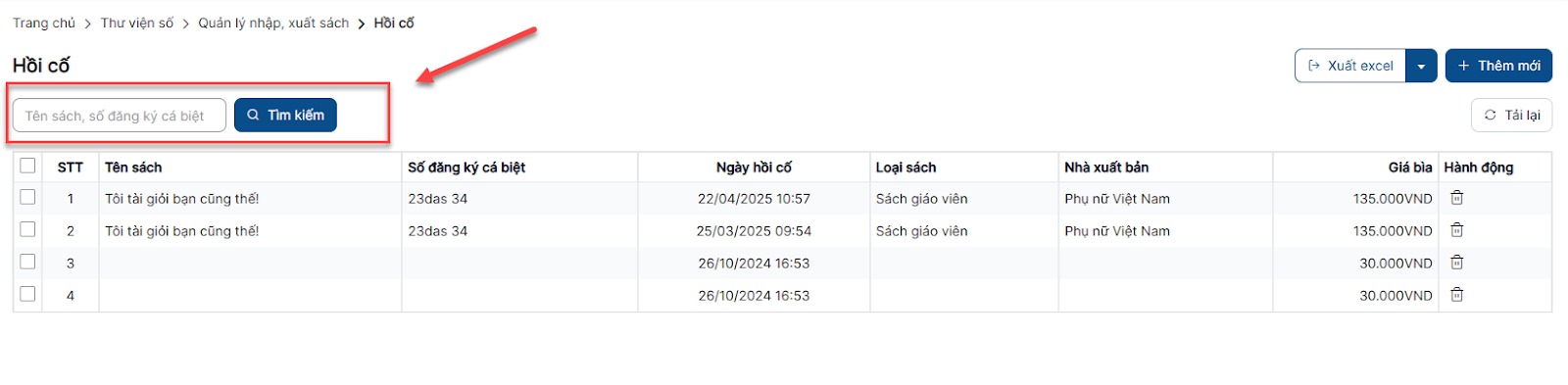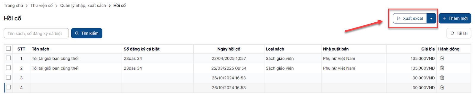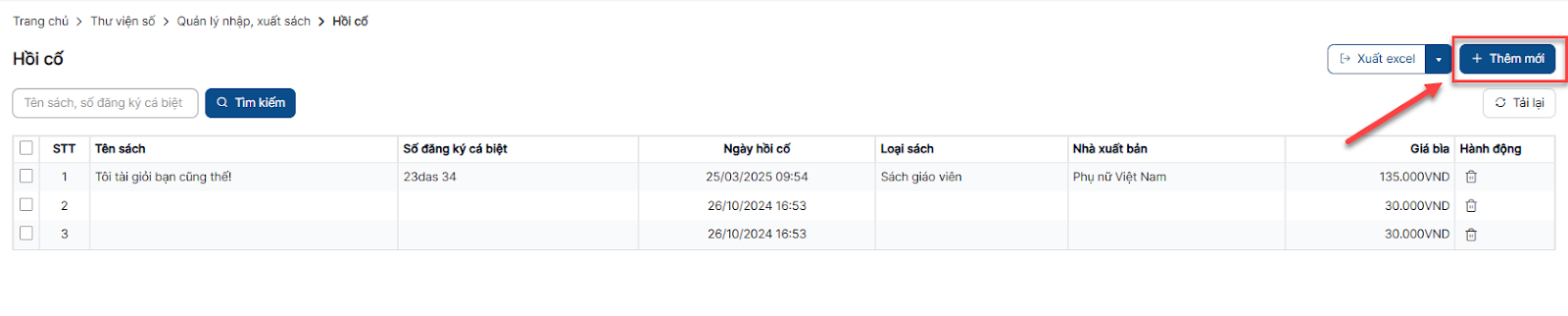 Bước 1: Trên màn hình danh sách > click button Thêm mới > Click button Thêm mới nhập sách
