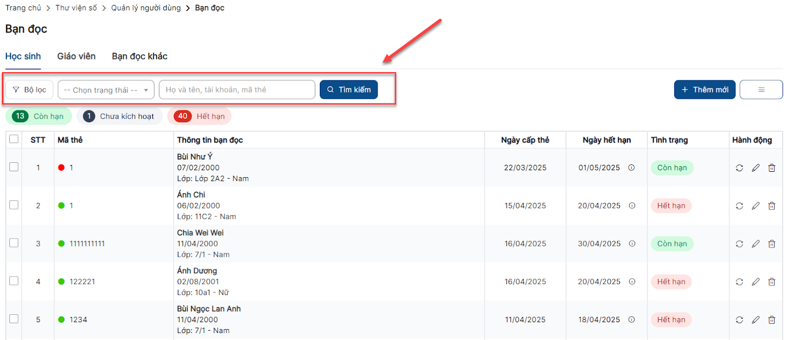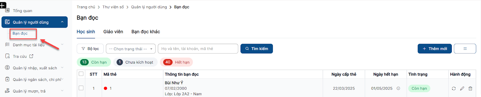 Bước 1: Tại menu Quản lý bạn đọc > Trên vùng tìm kiếm