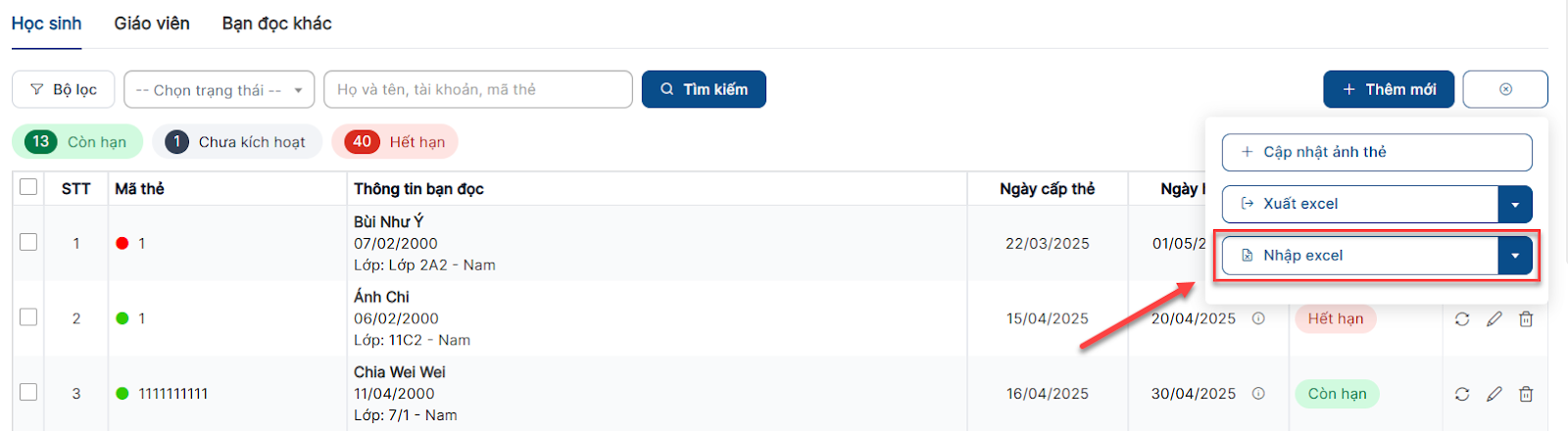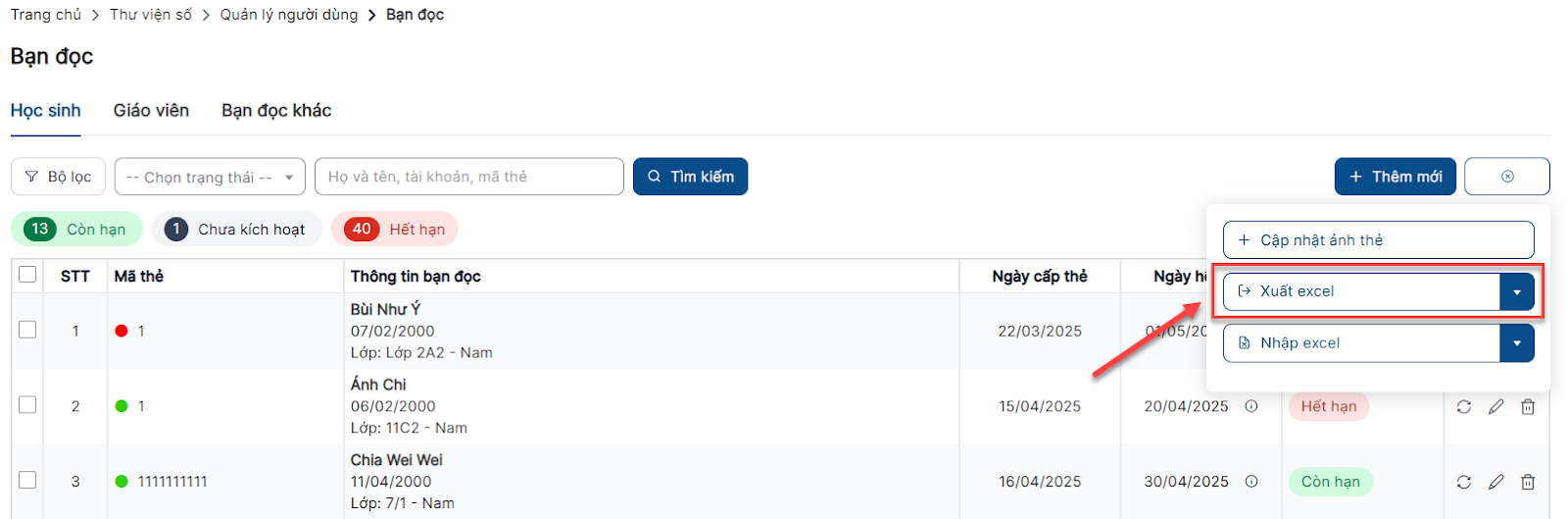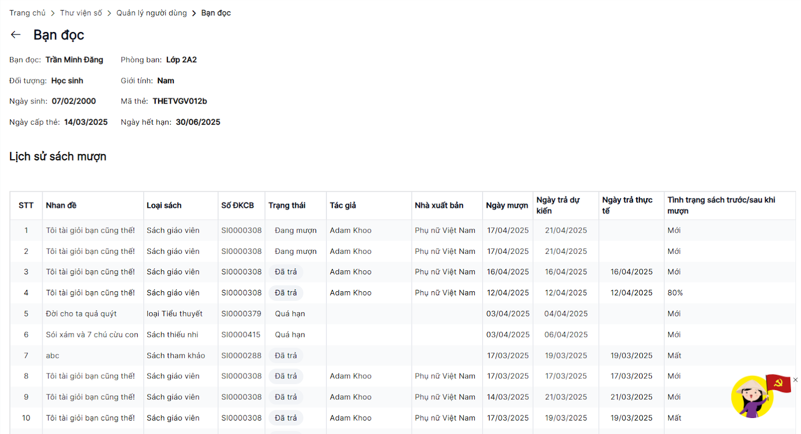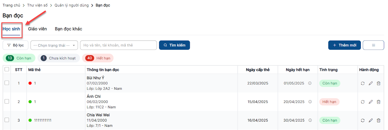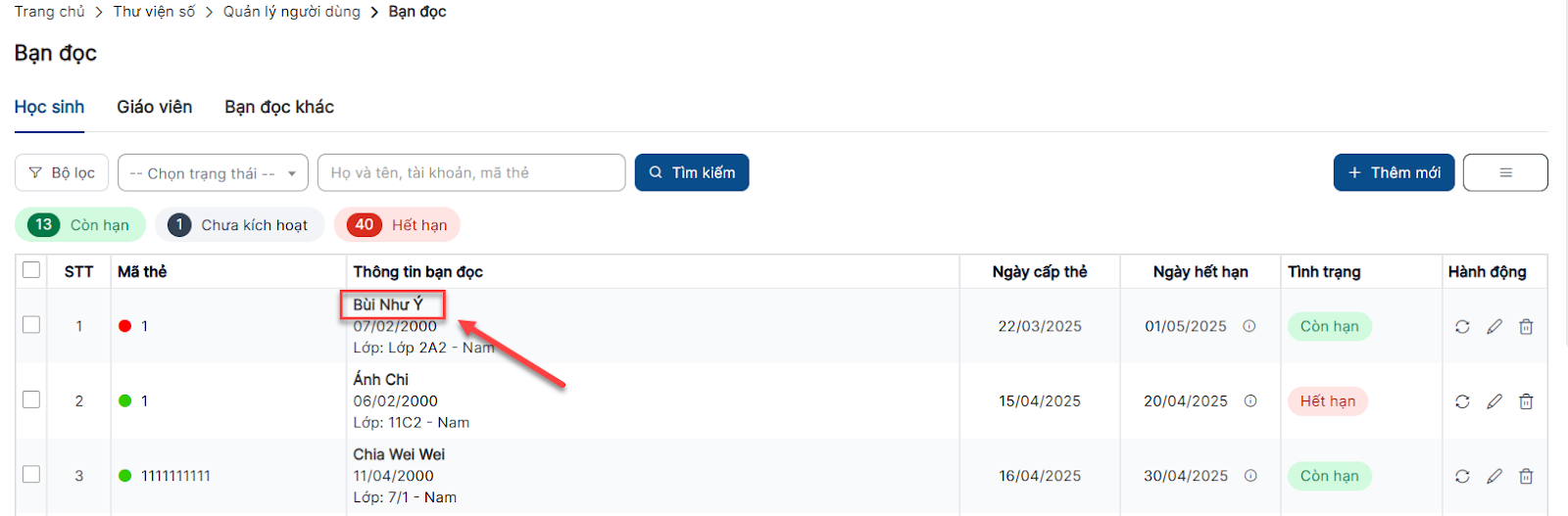 Bước 1: Trên màn hình danh sách học sinh > Click vào tên bạn đọc