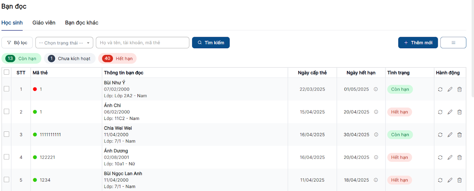 Mục đích: Quản lý, tạo thông tin thẻ bạn đọc, gia hạn thẻ